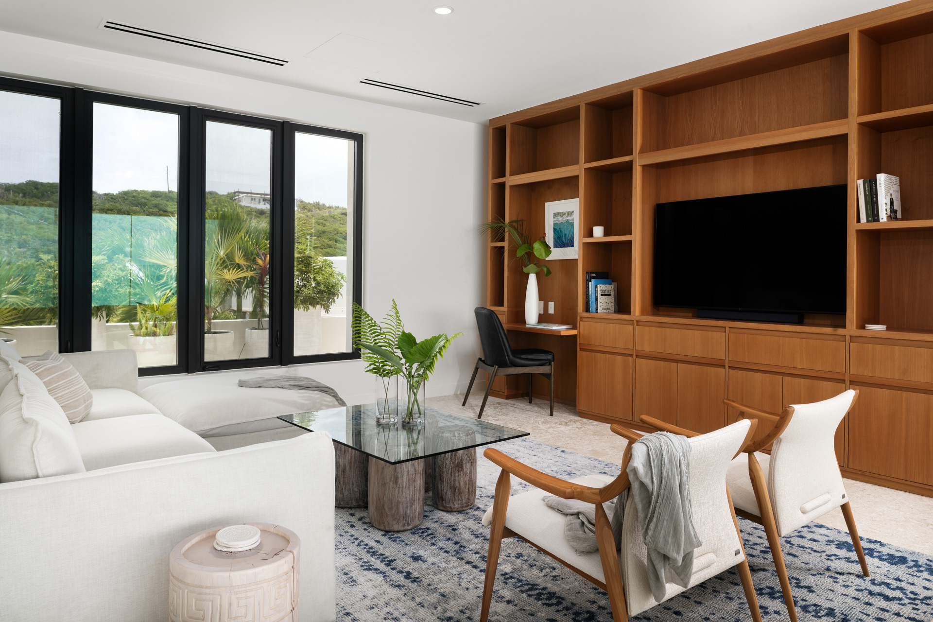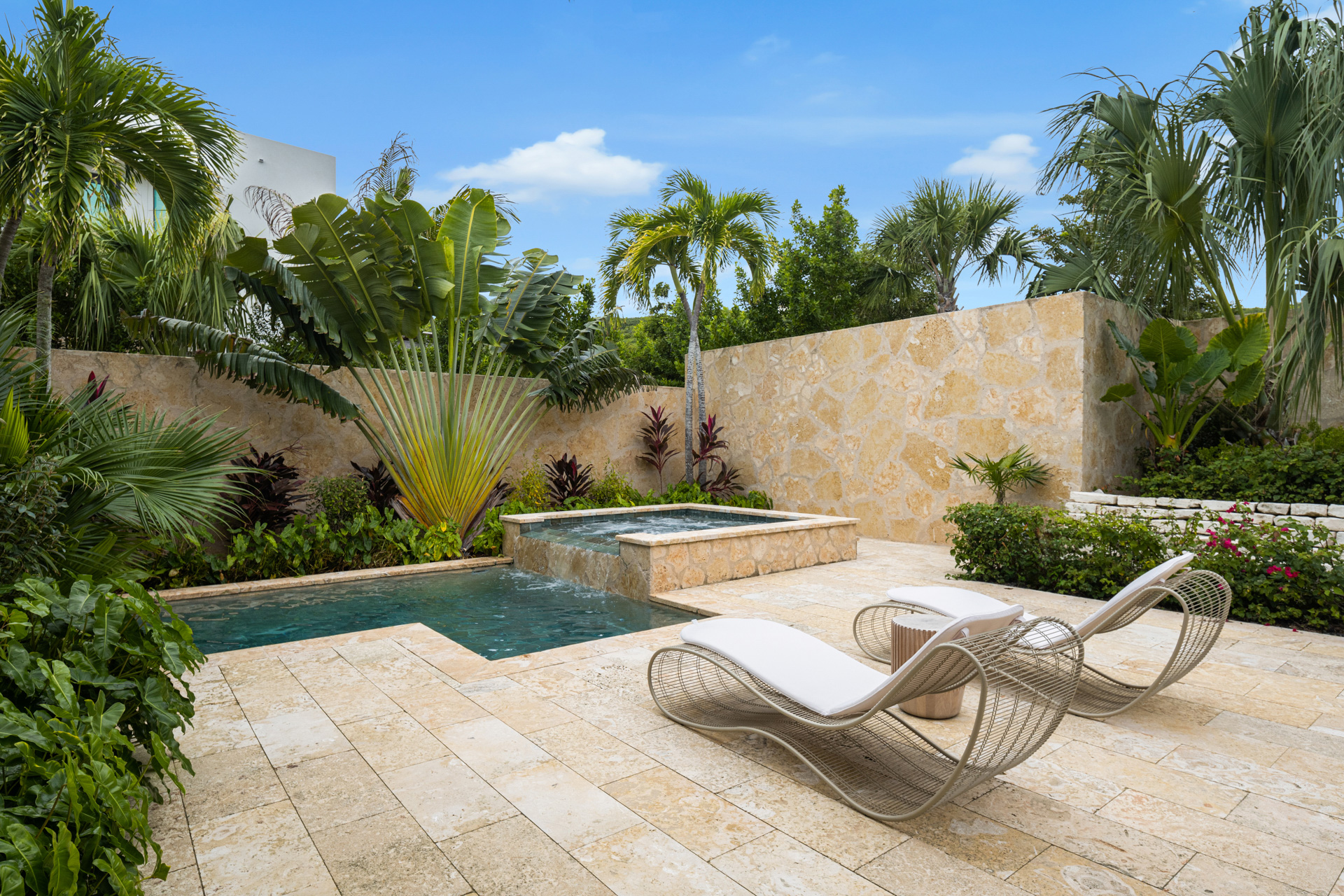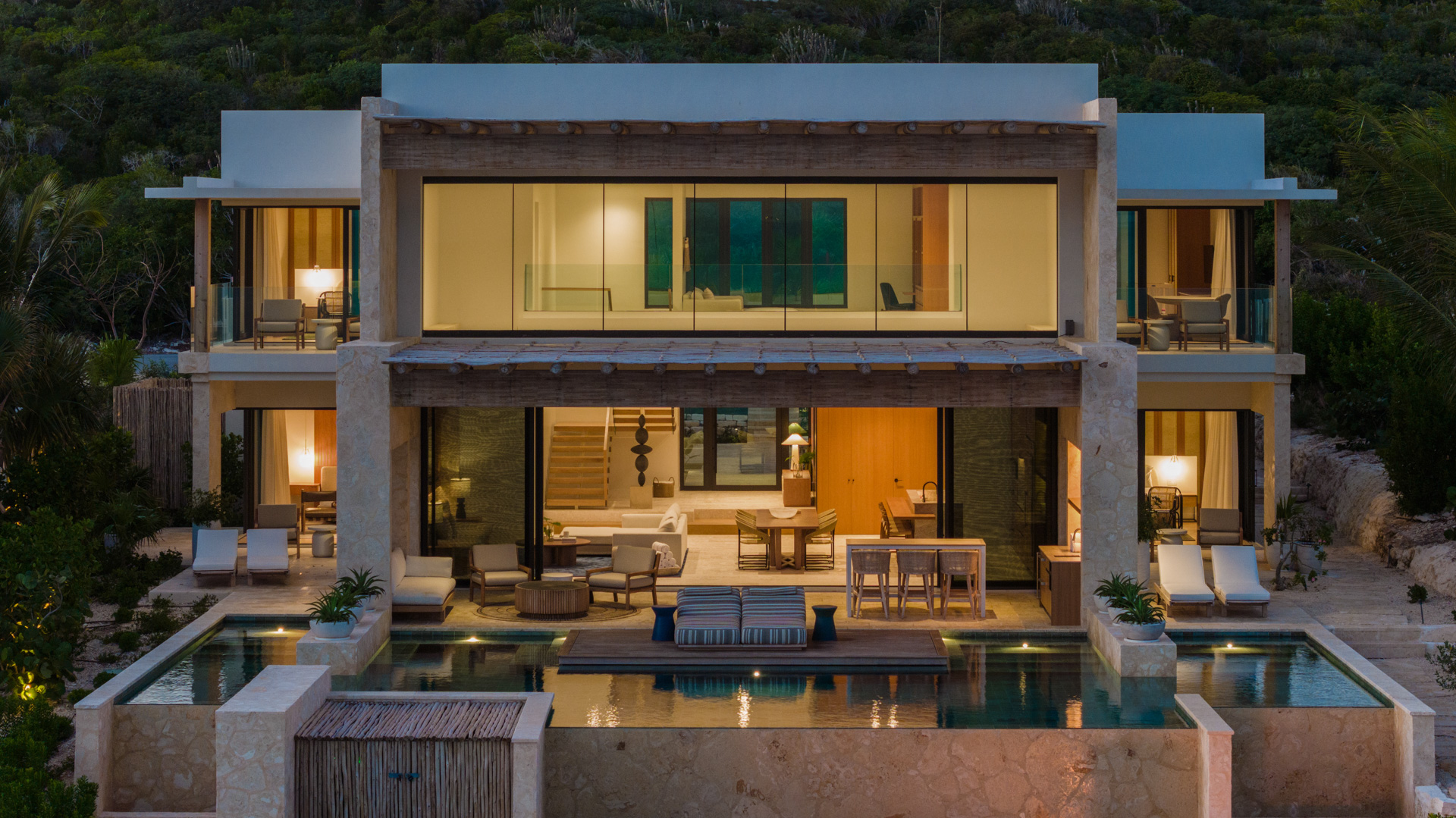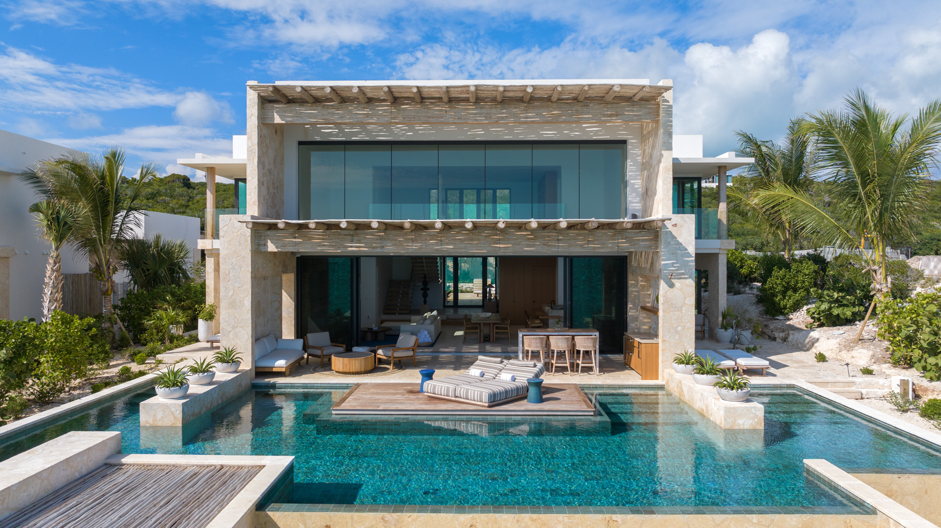 Ideal for families or even two families vacationing together, this elegant four-bedroom residences features a dramatic two-story great room overlooking the pool and the crystal clear blue water of the Caicos Banks. The main house has four oceanfront en-suite bedrooms, including two unique bedrooms with double queen/double twin euro bunk beds, handcrafted infinity pool, and a lush courtyard with an outdoor kitchen and spa. The residence has private access to a grotto beach.